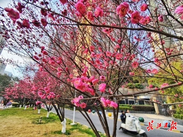 1월 14일 아침, 우창의 룽차오화푸(Rongqiao Huafu) 커뮤니티에서 한 그루 한 그루의 붉은 매화가 아침 햇살 속에 피어나고, 일찍 일어난 주민들이 꽃 사이를 거닐고 있었습니다.