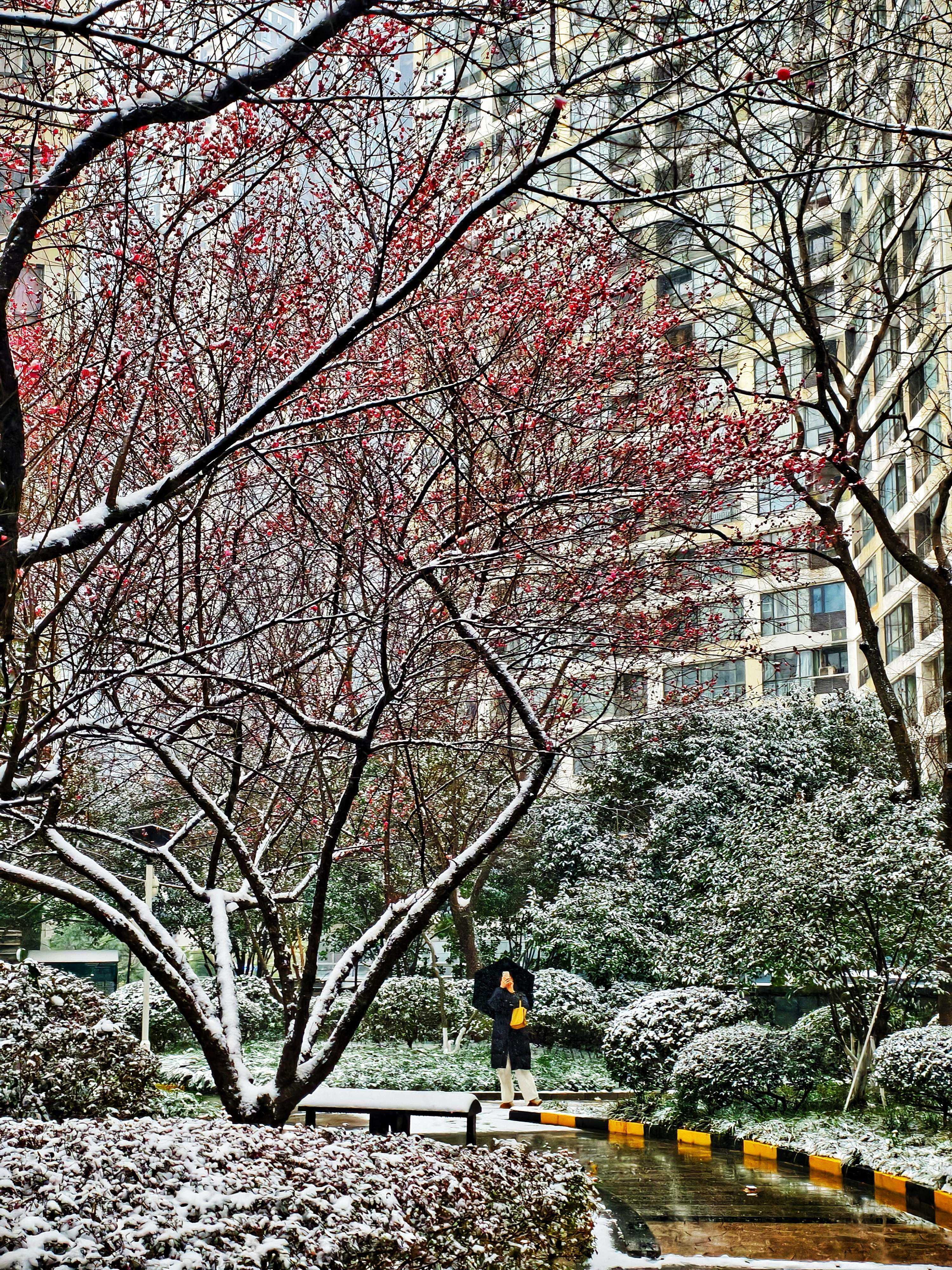 1월 20일, 우창의 롱차오 화푸 커뮤니티에서 눈 내린 후 붉은 매화가 가지마다 더욱 아름답게 피어났다.