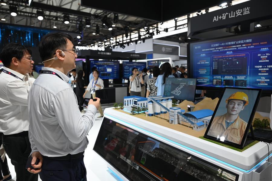 2025년 6월 18일 '모바일 월드 콩그레스(MWC) 상하이 2025'에 마련된 차이나모바일 부스에서 'AI+ 광산 안전 감독' 솔루션에 대해 알아보는 관람객. (사진/신화통신)